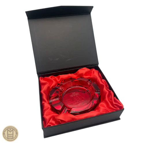 RAW Ruby Red Ashtray boasts a unique elongated octagonal shape crafted from solid lead-free crystal glass. This functional art piece features five distinct grooves designed to hold two regular cones and three cigar-sized rolls securely. The underside is lined with velvet to protect your surfaces from scratches, and it arrives presented in a premium magnetically closed case signed with the RAW logo. Ashtray Size: 11 cm x 13.5 cm x 3 cm (approx). Box Size: 15cm x 17.5cm.